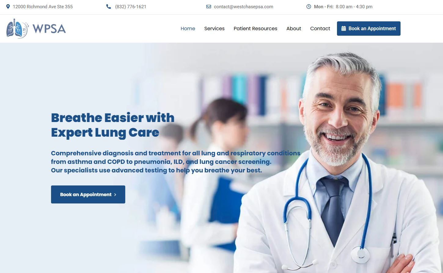 Westchase Pulmonary & Sleep Associates engaged me as a full-service digital partner to design, launch, and maintain their complete online presence from the ground up. The project covered the full lifecycle of website development, starting with domain transfer and hosting setup, through WordPress configuration, customization, branding, and long-term maintenance.